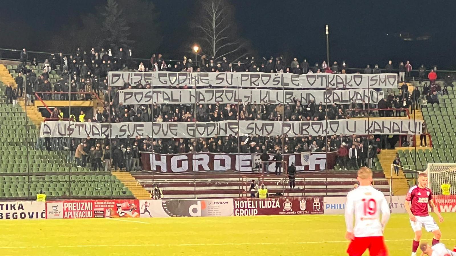Navijači Sarajeva, poznati kao Horde zla, uputili su jasnu poruku upravi bordo kluba tokom večerašnje utakmice protiv Veleža na stadionu Koševo. U trenutku kada je poslije prvog poluvremena rezultat bio 0:0, na sjevernoj tribini pojavio se veliki transparent kojim se kritikuje aktuelno stanje u klubu i podsjeća na davna obećanja rukovodstva.