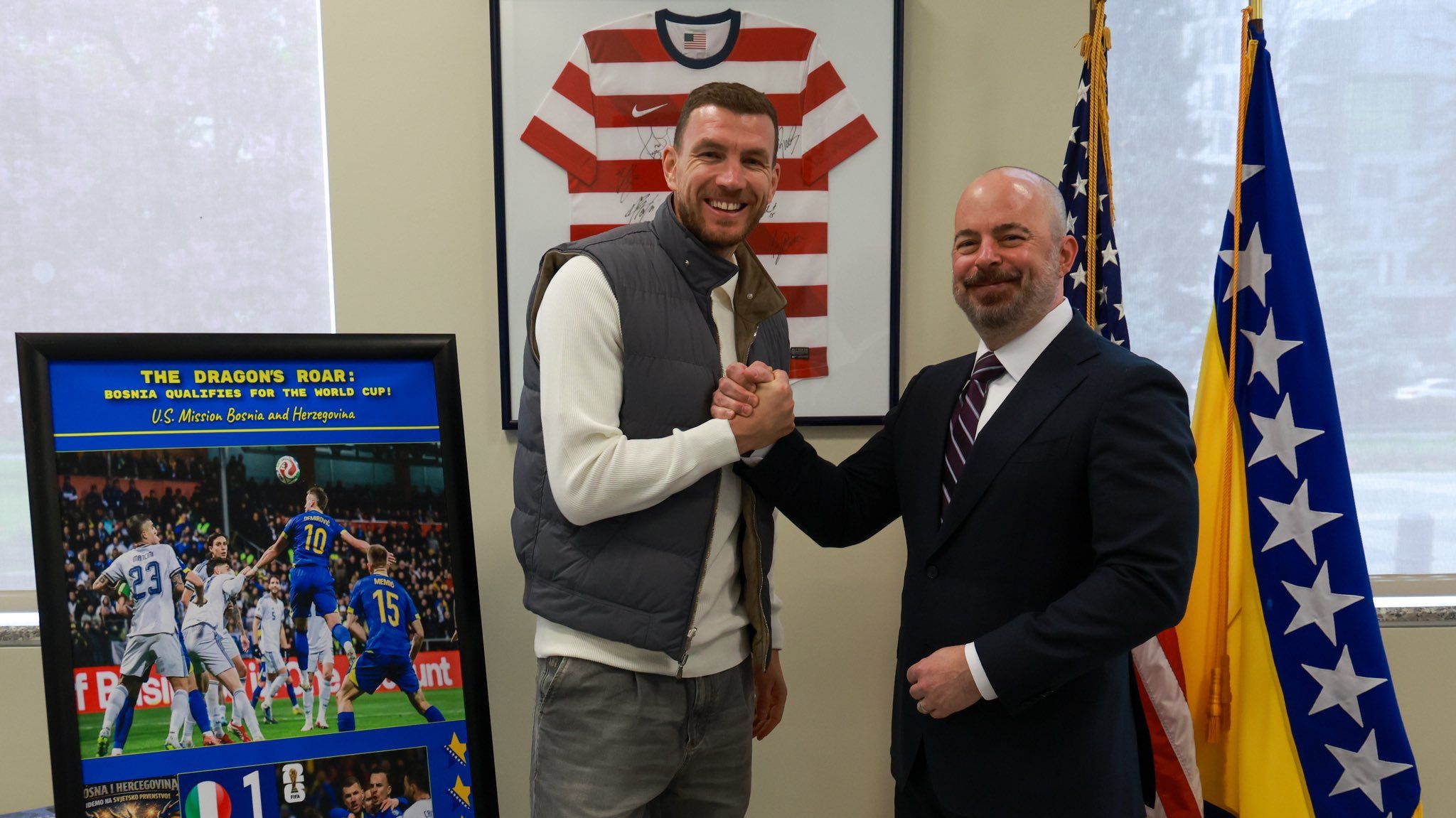 Reprezentaciju BiH ovog ljeta očekuje historijski nastup na Svjetskom prvenstvu, što će, prema ocjenama stručnjaka, imati pozitivan uticaj na popularizaciju fudbala u zemlji i dodatno učvrstiti sportske veze između Bosne i Hercegovine i SAD. “Cijeli tim i stručni štab ponosni su što predstavljaju Bosnu i Hercegovinu na ovako velikom takmičenju. Vjerujemo da ćemo opravdati očekivanja i dostojno predstaviti našu zemlju pred svjetskom publikom”, izjavio je Džeko nakon susreta sa američkim diplomatama.